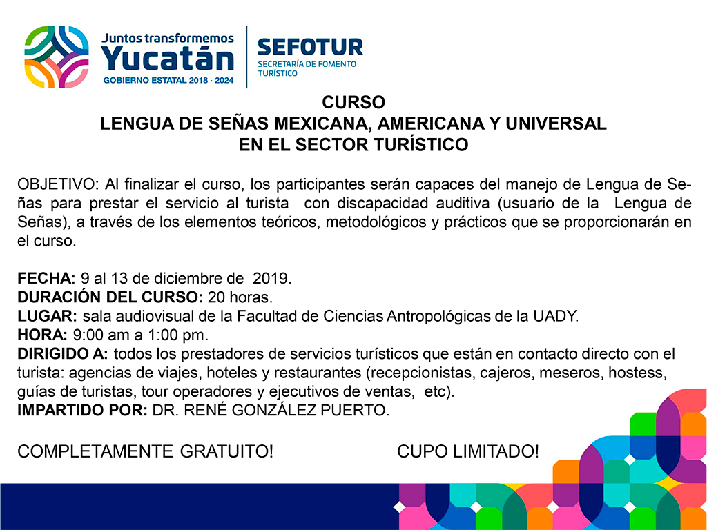 Por ello, el diplomado “Diplomado de Lengua de Señas Mexicana, Americana y Universal para el Sector Turístico” surge ante la necesidad de incorporar en la práctica de comunicación, elementos teóricos y prácticos sobre conceptos, métodos y técnicas usualmente empleados con el fin de que el “prestador de servicios turísticos” pueda comunicarse con el turista que padece de discapacidad auditiva y que desee visitar los atractivos turísticos del Estado de Yucatán.