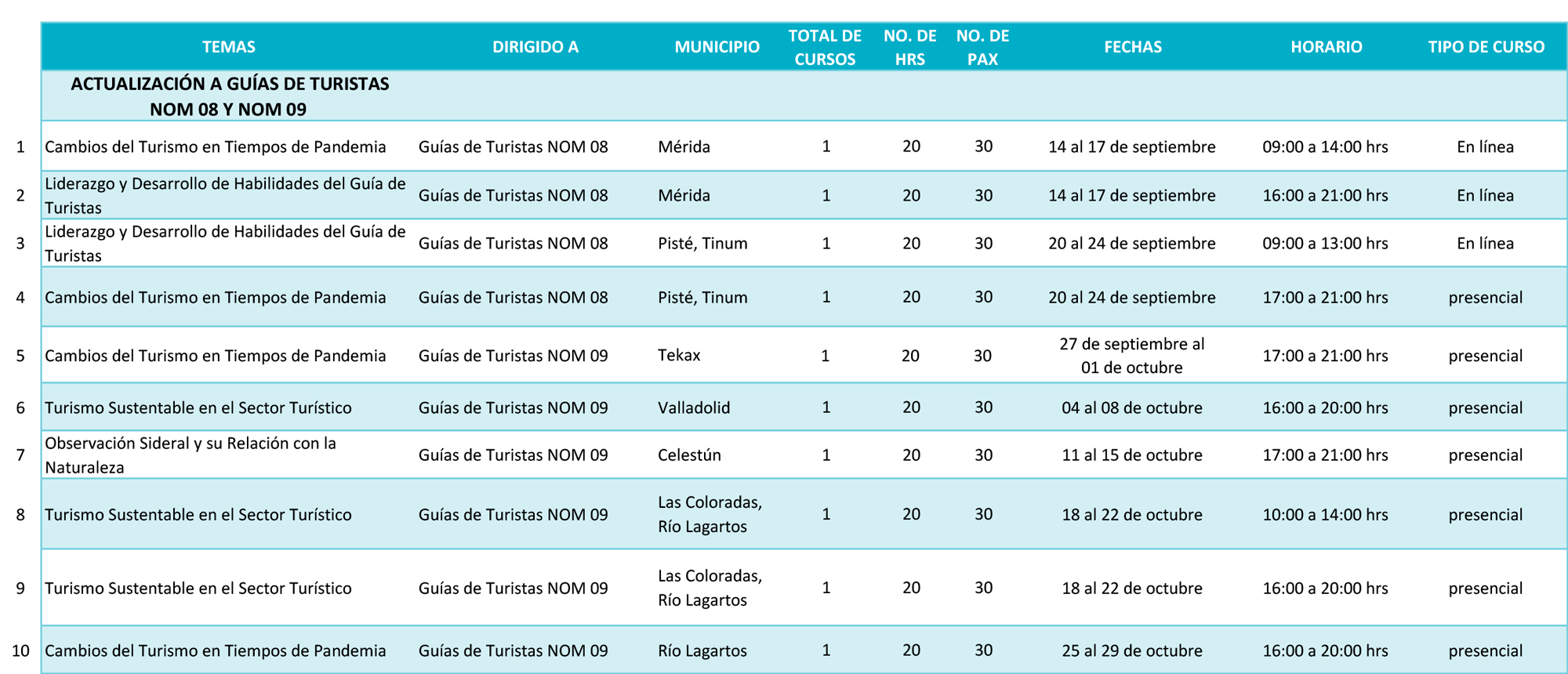 La Secretaría de Fomento Turístico, como parte de las acciones en materia de capacitación, les comparte el programa de cursos de actualización para guías de la NOM 08 y 09 con valor de 20 horas.